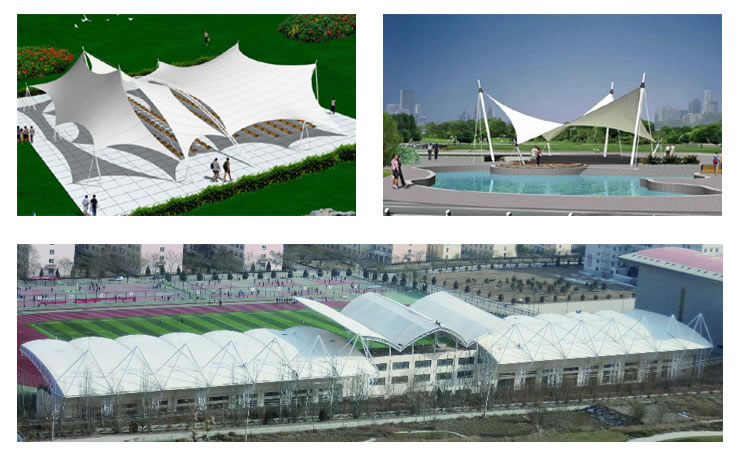 膜結(jié)構(gòu)所用膜材料由基布和涂層兩部分組成.基布主要采用聚酯纖維和玻璃纖維材料;涂層材料主要聚氯乙烯和聚四氟乙烯。常用膜材為聚酯纖維覆聚氯乙烯(PVC)和玻璃纖維覆聚聚四氟乙烯(Teflon)。PVC材料的主要特點(diǎn)是強(qiáng)度低、彈性大、易老化、徐變大、自潔性差,但價(jià)格便宜,容易加工制作,色彩豐富,抗折疊性能好。為改善其性能,可在其表面涂一層聚四氟乙烯涂層,提高其抗老化和自潔能力,其壽命可達(dá)到15年左右。Teflon材料強(qiáng)度高、彈性模量大、自潔、耐久耐火等性能好,但它價(jià)格較貴,不易折疊,對裁剪制作精度要求較高,壽命一般在30年以上,適用于***建筑。